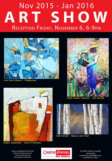 This is the last art show of 2015 at the Gallery featuring artists Stefan Geissbuhler, Mollie Freeman, Ana Maria Botero and Rob Wardell. Enjoy the refreshments and the beautiful artwork from painting to jewelry, metal sculpture and glass.